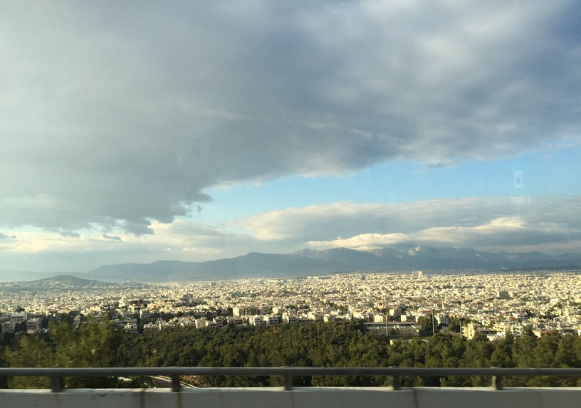 大巴正在行驶在进城高速上。雅典城大部分位于低矮的丘陵地段,海拔会有小幅度起伏,机场通往市区的高速公路多半延半山腰建造,行驶间,可以观赏到雅典城的略景:远处阳光透过云间空隙,犹如一道道光柱射向这座千年古城。城市面积很大,白色的民房成为了城市主体,丘陵的互相掩映,使得雅典城犹如一块起伏的地毯,上面散落着无数白色方块。不同于西班牙马德里,巴塞罗那等大城市,老城与高楼大厦共同成为城市肌理,城市天际线高低起伏,雅典似乎很平整,平缓有序,过渡自然,城区极少有高楼,更多的是集中连片的民宅与商店,卫城是全城的中心也是制高点。