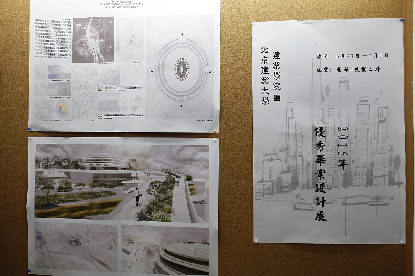 6月27日建筑公司2016年本科生优秀毕业设计展在教四楼二层展出。本次展出的14份优秀毕业设计作品从129份毕业设计作品中评选产生,包括7份校级优秀毕设作品和7份院级优秀毕业设作品,内容涉及建筑学、城乡规划、工业设计、历史建筑保护4个专业。