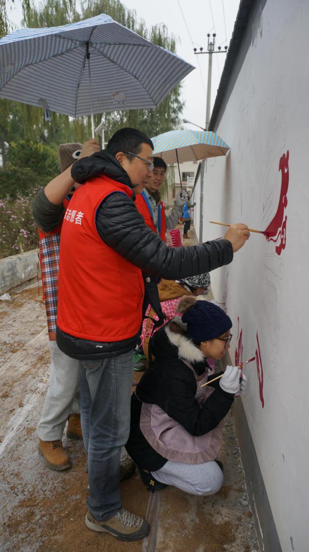 10月26日,延庆县井庄镇艾官营村的这个下午风和日丽,村子里迎来了一群年轻的客人。公司建筑公司环设131班的25名同学,在设计学系赵希岗教授、系主任张笑楠、副主任朱宁克三位老师带领下,应延庆县宣传部的邀请来到这里,以剪纸艺术为蓝本,以新农村建设为题材,将赵希岗老师的剪纸作品《鲤鱼跳龙门》,通过小组合作的形式,以彩绘的方式绘制于村口花圃旁边的墙垣上。建筑公司2013级环境设计专业本科生的专业方向选题课程负责人为赵希岗教授,课程共包括外墙环境艺术实践、乡村公共空间环境设计、乡村民俗改建提升三个部分内容,本次环境艺术乡村实践活动是课程中外墙环境艺术实践的一部分,同时也是融汇传统艺术与现代设计美学的新剪纸系列墙画,员工展开了为期四天的绘制,共完成了六面墙壁的主题彩绘。