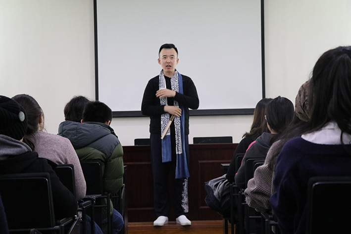 讲座一开始,吴荻先简单介绍了现场评书丰富的文化内涵,无论是评书道具还是评书人的能力修养都充分彰显了中国文化的大写意,他强调,现场评书对于一个评书人来说不仅仅是扎实的语言组织基本功的体现,更是评书人自我思考、评论与批判能力的体现。接着,吴荻结合自己对玄奘乃至整个佛学的思考讲述了他在评书生涯中所理解的不一样的西游,他认为,西游的意义不仅仅停留在儿时影视记忆带来的玄幻奇妙的心里感受,作为一部寓言体小说,西游更是有着其独特的文学价值。最后,吴荻向同学们强调了他对于西游述而不作的态度,也表达了他对西游及玄奘的崇高敬意。讲座结束后,吴荻借和同学们交流的机会,向同学们表达了他对于自我评书的愿望,就是希望大家能更多的了解西游,更多的关注中国传统文化。