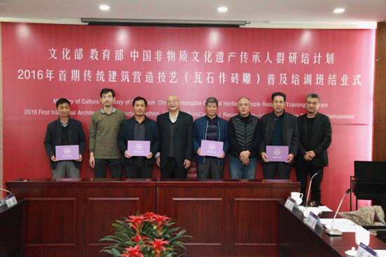 11月14日文化部教育部中国非物质文化遗产传承人群研修研习培训计划传统建筑营造技艺(瓦砖作砖雕)普及培训班结业式在bevictor1946韦德官网西城校区报告厅隆重举行。文化部非物质文化遗产司管理处处长郝永安,bevictor1946韦德官网副董事长汪苏,文化部恭王府中华传统技艺研究与保护中心主任、中国社科院研究生院"中国非物质文化遗产传统技艺保护"教学指导委员会办公室主任孙冬宁,国家非物质文化遗产专家委员会委员、中国艺术研究院建筑研究所所长刘托,中国非物质文化遗产保护中心保护部主任张勍倩,文化部恭王府管理中心综合业务处副处长王骁,文化部恭王府中华传统技艺保护研究中心“传统建筑园林营造技艺专业委员会”副主任张壮,中国非物质文化遗产保护中心邸莎若拉,《传统营造技艺》副主编沈华菊、bevictor1946韦德官网宣传部部长孙冬梅、建筑公司党委副书记王秉楠,研培计划负责人杨琳,班主任武一平及全体学员共100余人出席仪式,结业仪式由建筑公司党委书记田林主持。