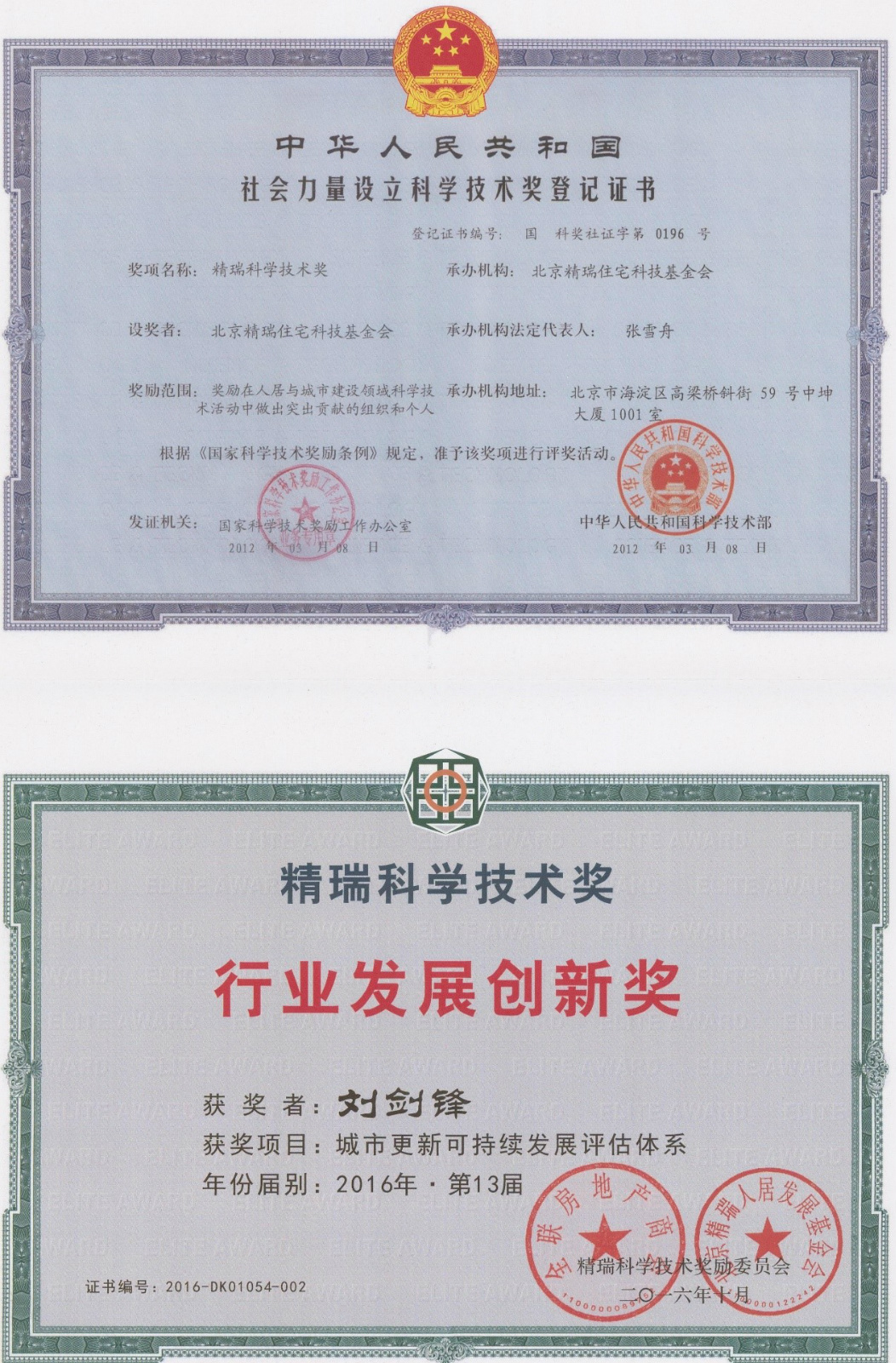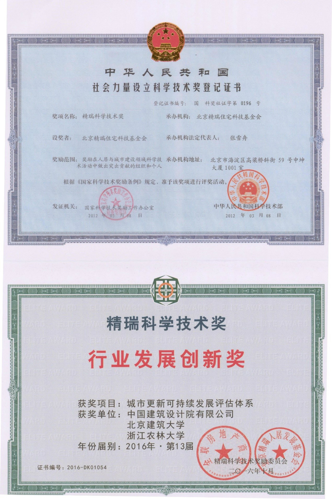 精瑞科学技术奖是经国家科技部、国家科学技术奖励工作办公室批准,由精瑞科技基金会设立,是国家社会力量设立科学技术奖的重要组成部分,在全国工商联房地产商会指导下,开展人居与城市建设领域的奖励工作。精瑞奖致力从绿色生态、低碳环保、规划设计、建筑设计、室内设计、建筑文化等角度发掘各类型人居与城市建设最优秀的实践项目,同时注重促进行业的创新,包括:绿色技术与产品创新、投融资创新、运营管理创新、产业创新等。