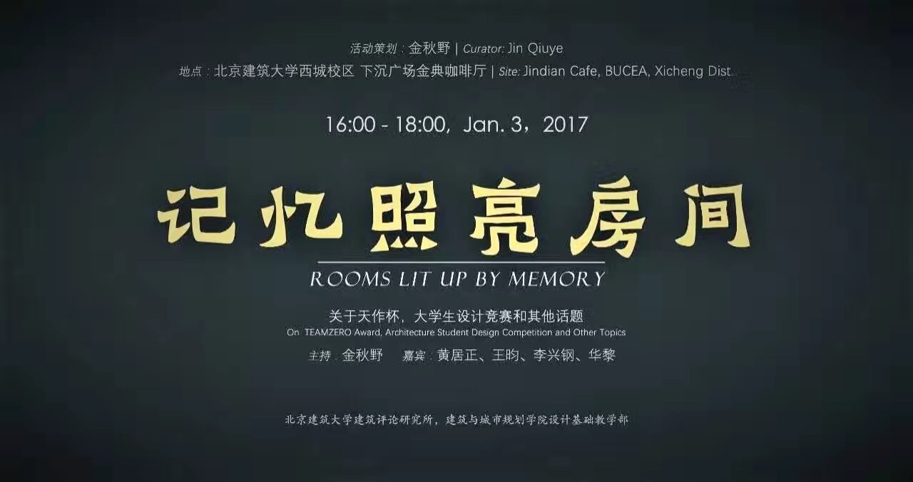 2017年1月3日16时,在bevictor1946韦德官网西城校区金点咖啡厅,由北京未来城市设计高精尖创新中心、bevictor1946韦德官网建筑公司主办,bevictor1946韦德官网建筑评论研究所、建筑公司团委承办的“记忆照亮房间”主题沙龙如期举行。此次沙龙活动由建筑公司金秋野教授策划,参会嘉宾包括:建筑公司副经理胡雪松、建筑学报主编黄居正,TAO迹建筑事务所创始人华黎,中国建筑设计研究院副总建筑师李兴钢,ADA研究中心主任王昀,北京建工建筑设计研究院副经理边志杰,同济大学出版社群岛工作室主持人秦蕾,以及公司青年教师程艳春、王韬、刘烨、丁光辉、郝石盟、黄庭晚、成慧祯等,沙龙由金秋野教授主持。沙龙现场大咖云集,各位主讲嘉宾均担任过各类设计竞赛的组织者、出题人或评委,此次沙龙主要以设计竞赛为中心展开讨论,分别就“如何面对竞赛”、“竞赛在学习中扮演的角色”、“竞赛与课程设计的关系”、“如何参与竞赛”、“一份好的竞赛作品是怎样的”、“竞赛所要传达的价值观”等议题展开讨论,旨在使同学们了解竞赛目的、摆正参赛心态,以及找准切入方向。