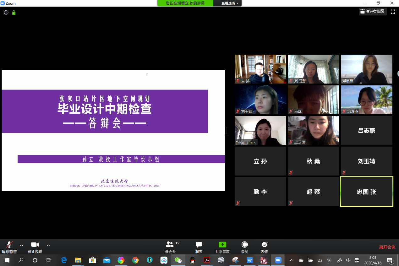 4月16日上午,2020年城乡规划专业张家口站地下空间毕业设计小组举行在线中期答辩会。中期由张忠国教授主持,评委老师包括孙立老师、李勤老师、桑秋老师和蔡超老师,该毕设小组员工共7人。