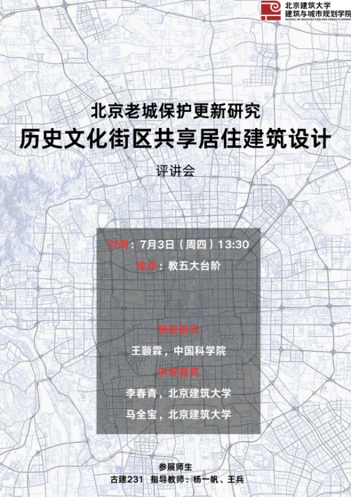 7月3日“历史文化街区共享居住建筑设计”课程讲评会在bevictor1946韦德官网西城校区教五楼圆满举办。讲评活动邀请了中国科公司的王颢霖副研究员,bevictor1946韦德官网李春青教授,马全宝副教授作为讲评嘉宾,古建231班同学和指导教师杨一帆老师,王兵老师共同参加讲评会,通过汇报、答辩和评价,全面总结了此次设计课程成果。