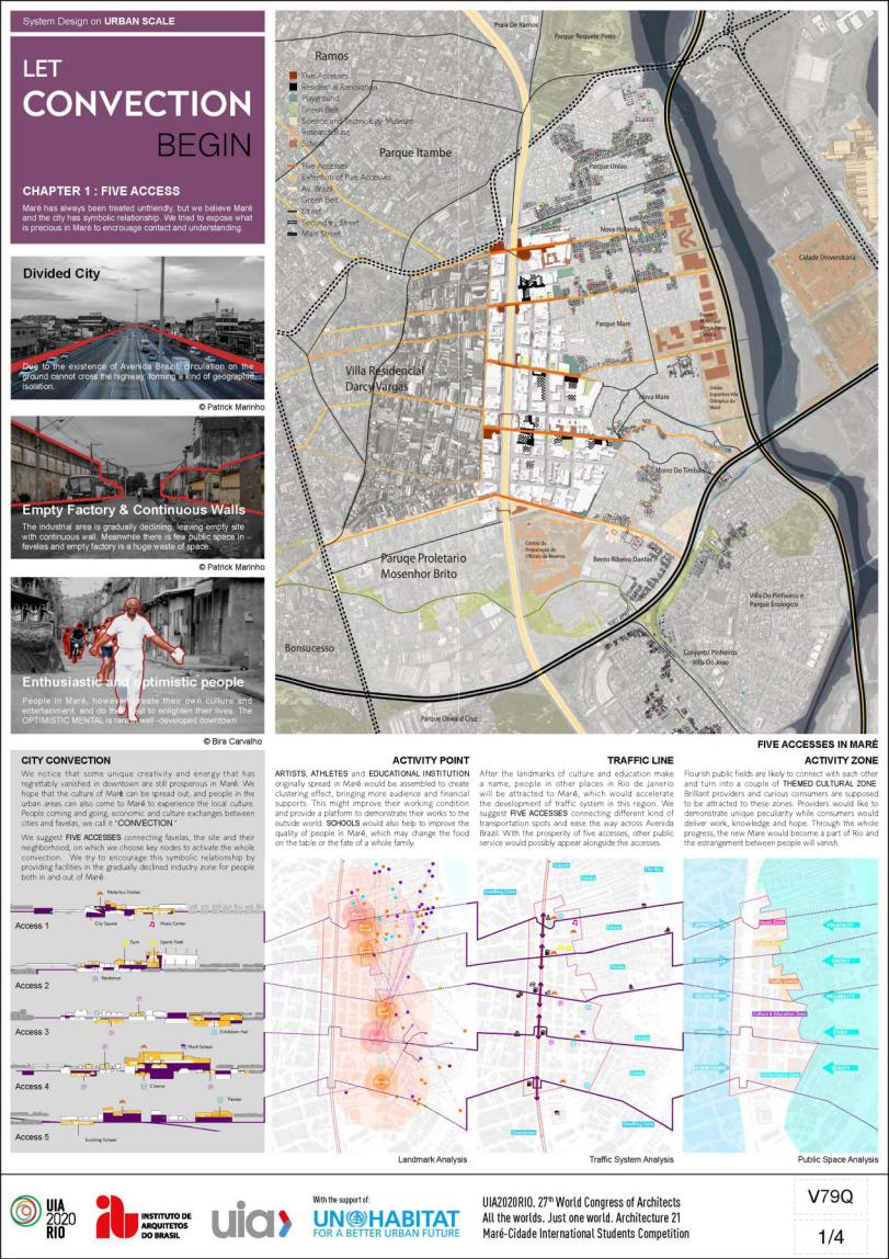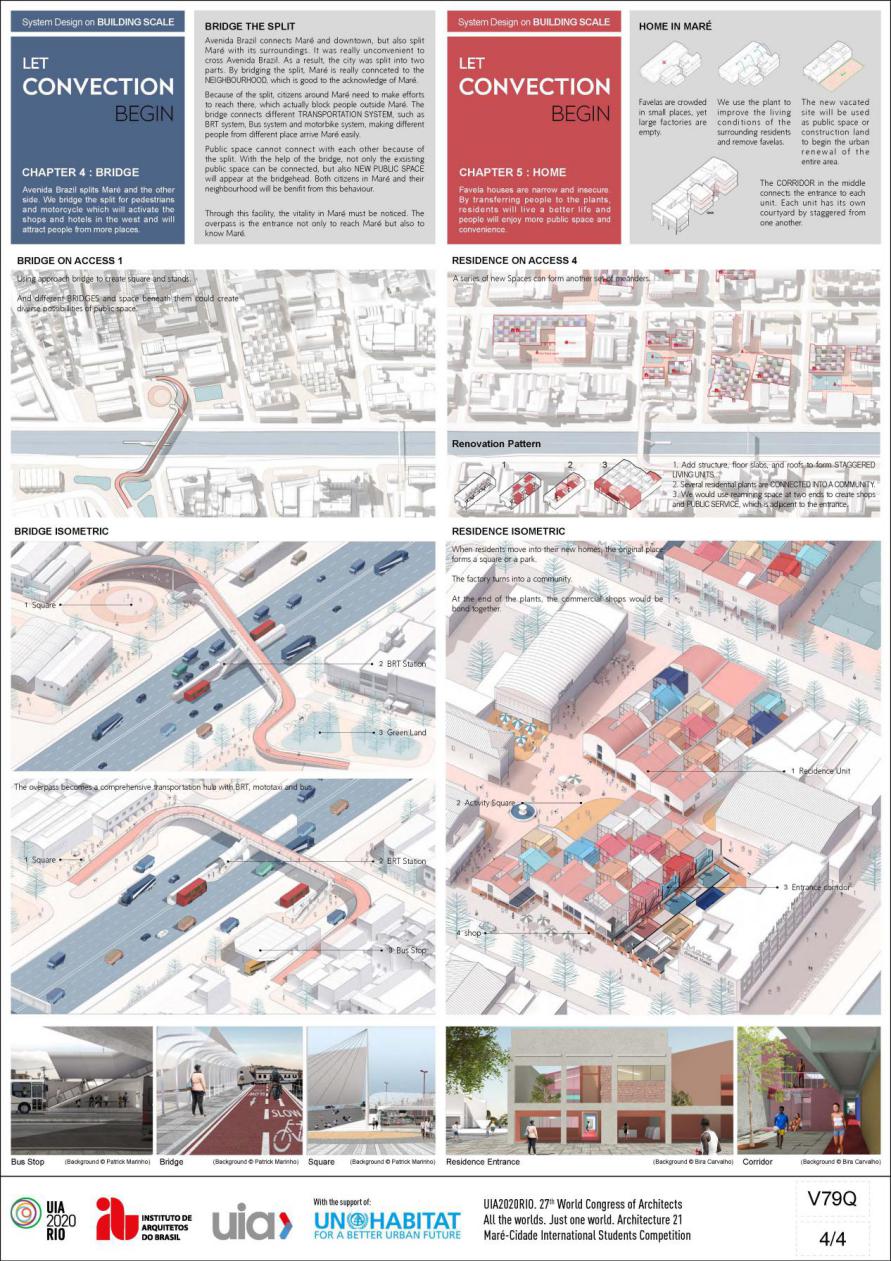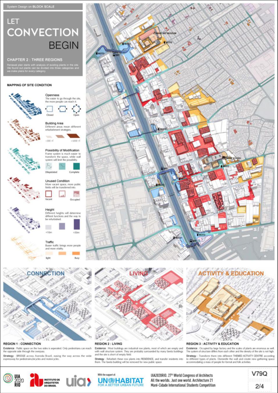 地块位于巴西里约热内卢的马里(Maré),在这里,一些在市中心已经消失的独特创造力和活力仍然繁荣(街头桑巴舞,实验性说唱音乐和民间比赛等)。设计希望可以通过在逐渐衰落的工业区中提供某些设施,让人们来体验并传播Maré的文化,促进城市和贫民窟之间的经济和文化交流,并将其形容为“对流”。在城市尺度上,设计提出使用五条轴线来连接贫民窟、基地及其周边,并在这些轴线中选择了部分关键节点,将工厂改造成文化和教育地标,以激活与城市的对流。在区域和建筑尺度上,设计根据建筑状况,将其分为三大类,据此提出了不同的策略,以在教育、交通、公共空间和住房方面提高Maré的环境和建筑空间质量。