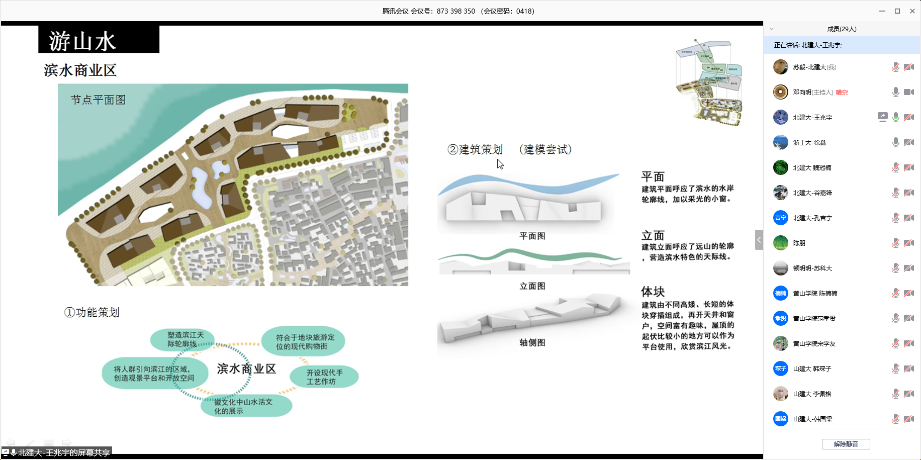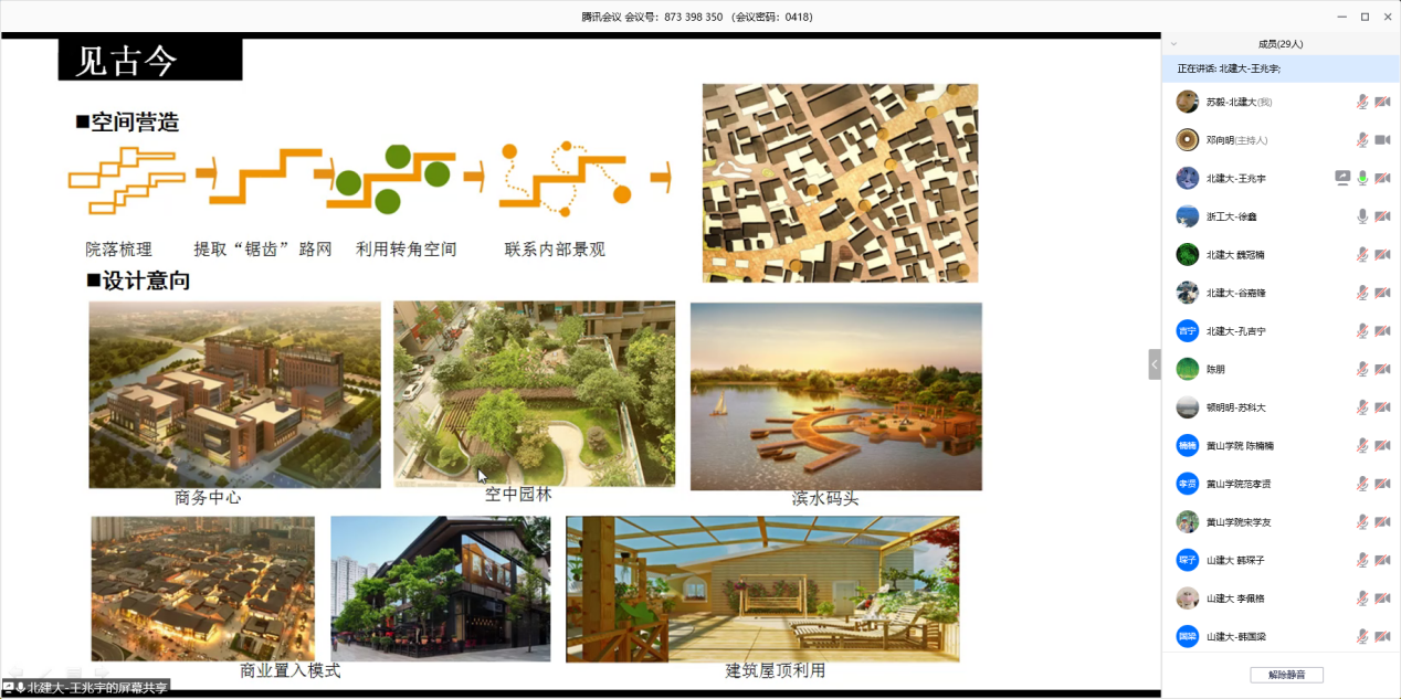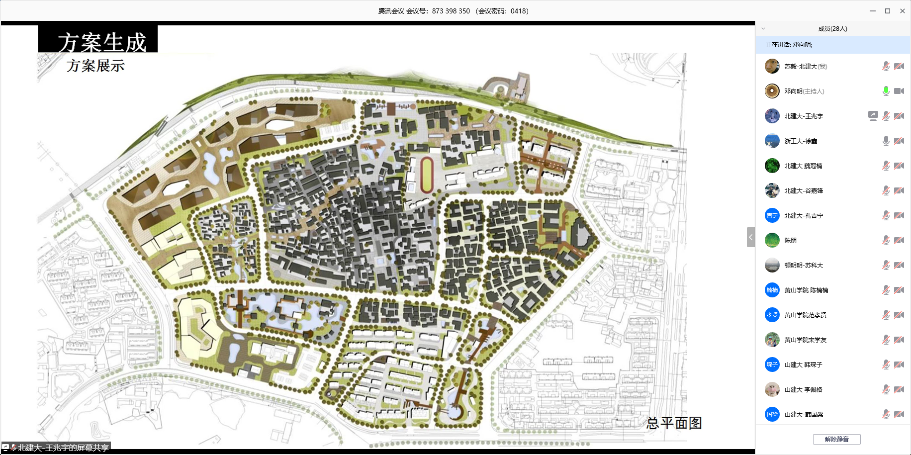 2020年4月18日,由安徽建筑大学建筑与规划公司承办,公司与苏州科技大学、山东建筑大学、西安建筑科技大学、安徽建筑大学、浙江工业大学、福建工程公司组成联合毕业设计教学团队,在线上成功举行了2020年城乡规划专业本科“7+1”联合毕业设计中期答辩。来自7所院校的18位教师、67位员工在云端相聚,就此次联合毕业设计的中期成果开展充分的交流。本次中期答辩借助腾讯会议平台线上举行。规划系张忠国、苏毅两位老师带队参加此次活动。