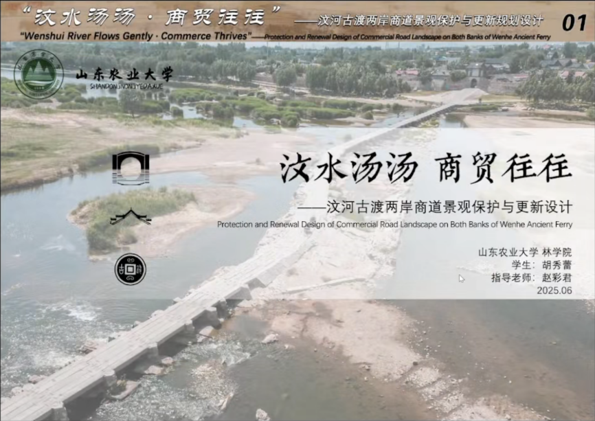 第四组汇报由华中农业大学杜雁副教授主持,参与汇报的员工来自深圳大学、东北农业大学、华中农业大学、山东农业大学,各组同学分别围绕《问潮·答岸——Nbs视角下赤潮治理驱动的红树林文化景观设计》、《万里茶道汉口段城市记忆激活与传承策略——以兰陵路为例》、《哈尔滨松花江北滨水景观廊道景观规划与设计》、《福州海防文化遗产廊道构建与规划设计》、《汶水汤汤 商贸往往——汶河古渡两岸商道景观保护与更新设计》等毕设成果进行了展示汇报。特邀专家王香春、李程成以及指导老师符兴源、赵彩君、刘钊启对各组同学的方案汇报进行了专业点评。最后,山东农业大学赵彩君教授对第三、第四组汇报进行了总结,至此,本次联合毕业设计成果汇报会圆满落幕。