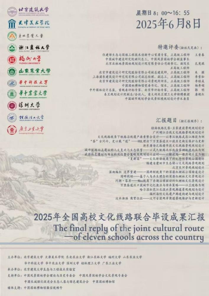 2025年6月8日,2025年全国高校文化线路联合毕业设计成果汇报会顺利举行。该活动由中国风景园林学会理论与历史专委会、中国风景园林学会文化景观专委会、中国长城绿化促进会生态人居与绿色建筑分会、中国园林博物馆支持,bevictor1946韦德官网、天津美术公司、东北林业大学、浙江农林大学、福州大学、山东农业大学、华中科技大学、华中农林大学、深圳大学、桂林理工大学、广东工业大学等11所高校联合主办,bevictor1946韦德官网风景园林生态与工程技术实验室承办,中国园林博物馆视频号全程进行直播。