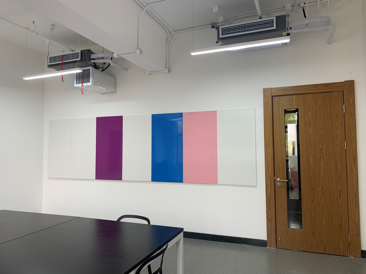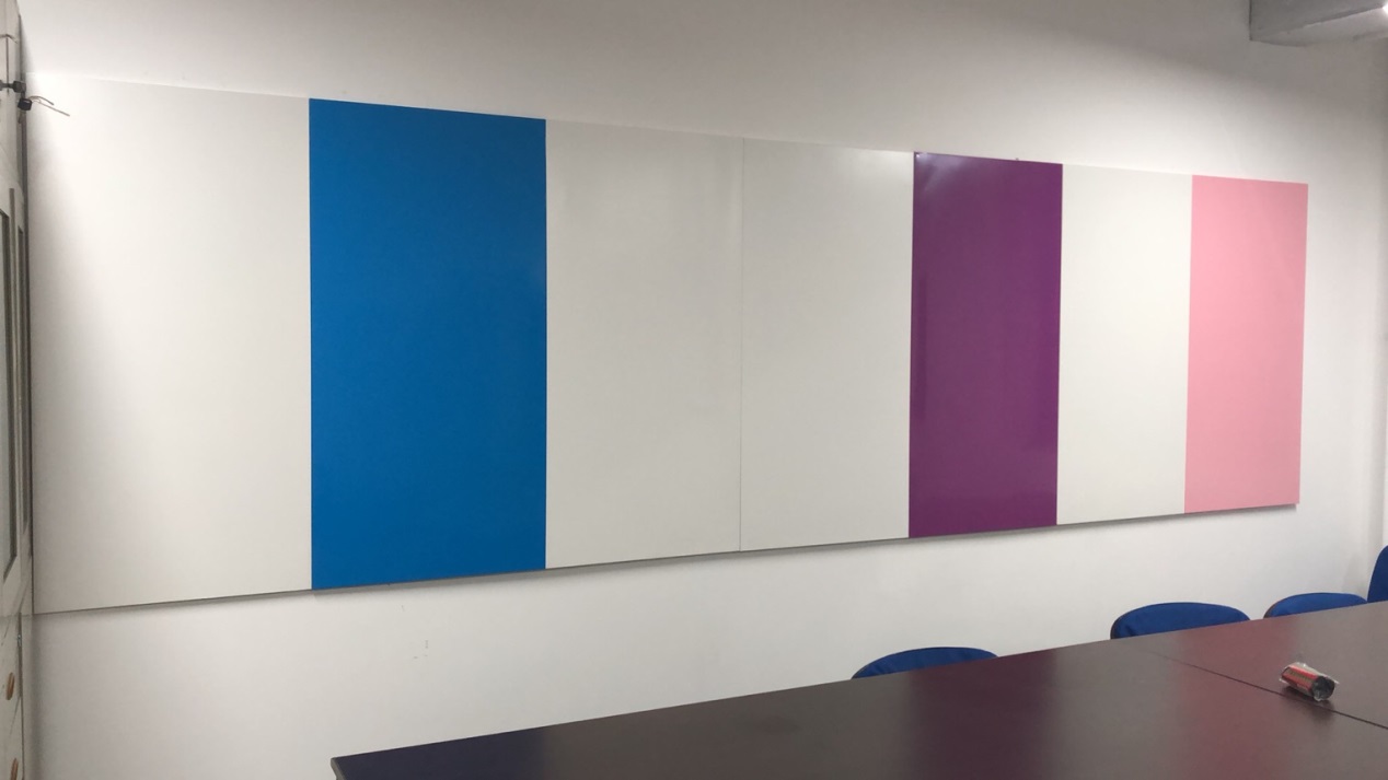 除此之外,教室内的墙上还整面铺设了彩色挂板,不仅可以在磁面贴上板书,还可以挂图评图,甚至可以自由组合彩色挂板使教室环境更加充满活力。