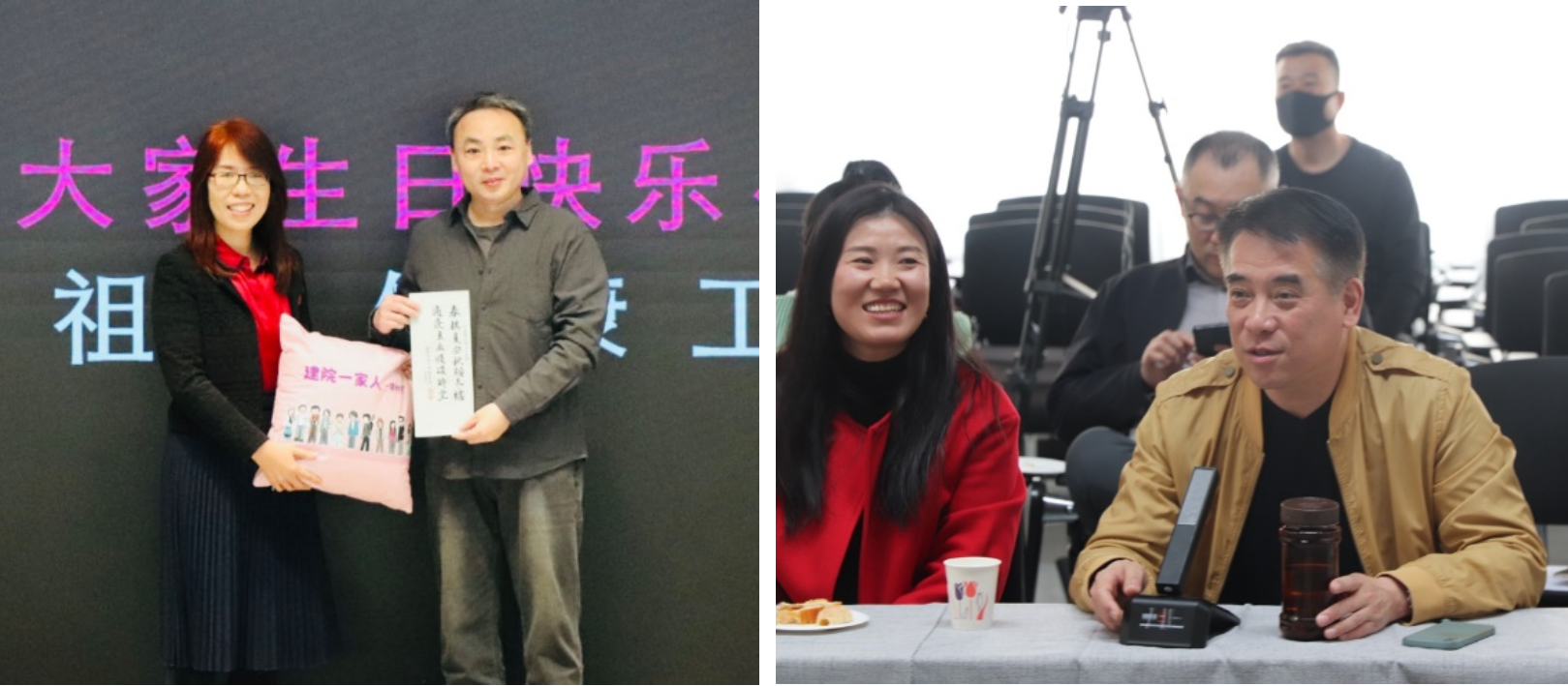 建筑公司手写生日笺已逐渐成为公司文化传统。本月由建筑系王光新老师亲笔书写“春祺夏安秋绥冬禧,适逢良辰顺颂时宜”,并加盖王老师篆刻的“bevictor1946韦德官网”印章;郝老师请女儿为四月生日的老师绘制了卡通头像,将之印制在基于公司校徽“建大紫”制作的蓝、粉两色靠垫上作为生日礼物。美术部朱军教授为寿星们逐一颁发贺卡与礼物并送上生日祝福。本月寿星之一、历史建筑与保护工程系陈雳教授作为代表上台为大家切下苹果派的第一刀,陈霞妹老师、谭鑫老师、吴昕泽老师等把糕点送到每位老师手中。品尝美味佳肴、相聚畅聊的生日会美好时光,为紧张忙碌的建大校园生活增添了别致的风味。
