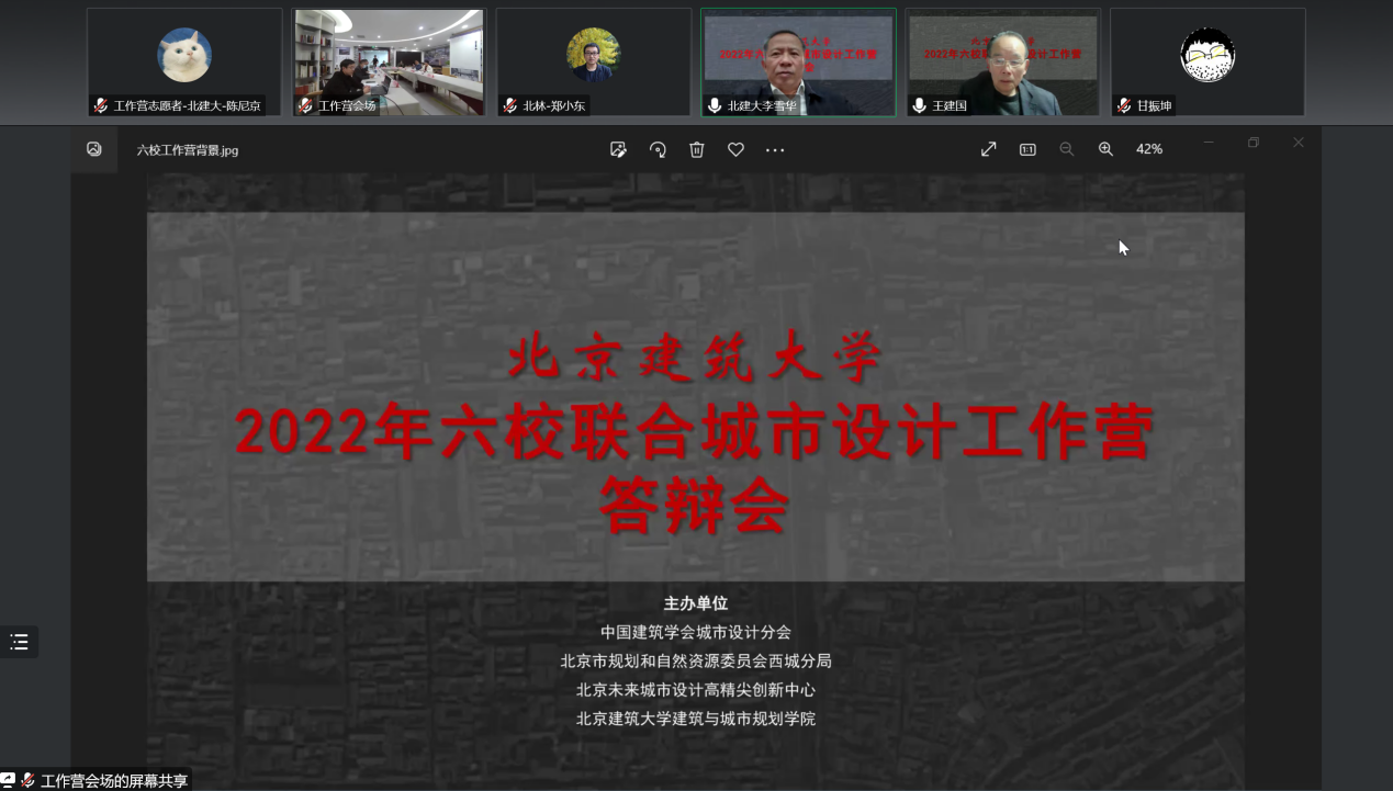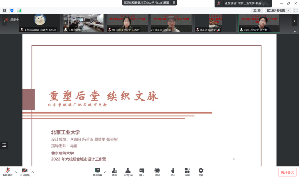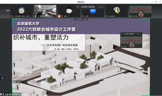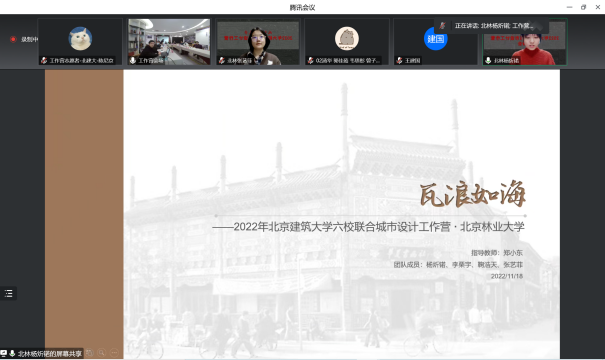 11月18日晚,作为“2022(第六届)北京国际城市设计大会”的重要平行学术活动,由中国建筑学会城市设计分会、北京市规划和自然资源委员会西城分局、北京未来城市设计高精尖创新中心、bevictor1946韦德官网联合主办的“bevictor1946韦德官网2022年六校联合城市设计工作营”答辩会,在西城区赵登禹路42号北京老城保护更新基地线下和腾讯会议同步举行。