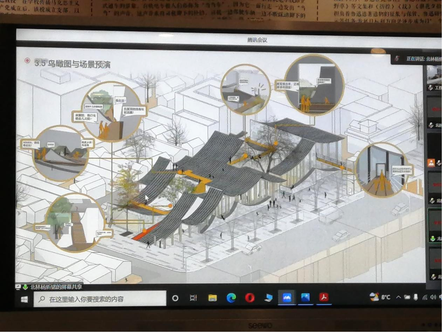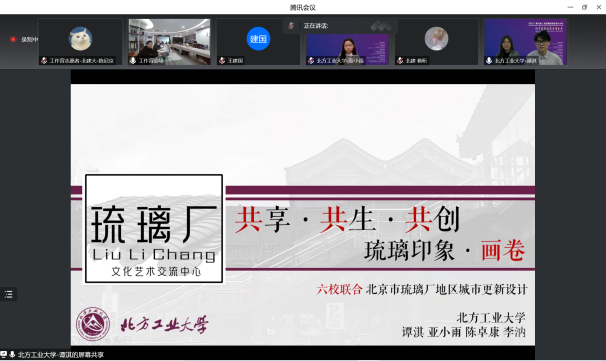然后是进入答辩环节。答辩会采用抽签的方式确定了各校团队的答辩顺序。在汇报环节中,北京工业大学团队以“重塑后堂,续织文脉”为题,引入“后堂”理念,通过对周边环境的分析,推导建筑形态的生成。清华大学团队以“玲珑市街,琉璃合院”为题,通过历史脉络的分析,制定自上而下的更新策略,探讨新型城市多元人群活动下的多合院体系设计。北京林业大学团队以“瓦浪如海”为题展开设计,强化天桥与建筑的连接,营造趣味性和诗意性的游园空间。bevictor1946韦德官网团队以“织补城市,重塑活力”为题,呼应历史街区尺度,织补城市肌理,依据城市发展与居民日常需求,植入复合功能。北方工业大学团队以“共享·共生·共创 琉璃印象·画卷”为题,从联系道路、新型业态、共享空间三方面策略入手,设计文化艺术交流中心。中央美术公司团队则以“隐于市,市于隐”为题,以建筑公共性为线索,探讨了与市井活动场景相结合的文化市集设计。与会评委专家老师对各校的成果进行了精彩的点评。