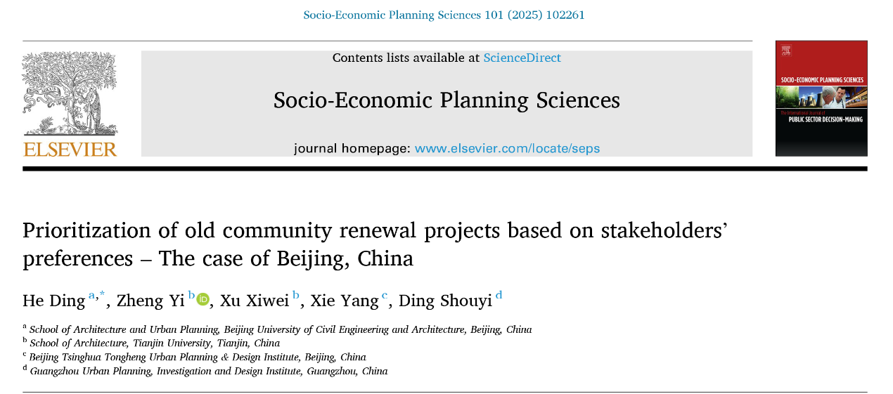 建筑公司历史建筑保护系贺鼎副教授与研究生郑毅等作者在社科领域Top期刊《Socio-Economic Planning Sciences》发表论文“Prioritization of old community renewal projects based on stakeholders' preferences – The case of Beijing, China”。该期刊是Elsevier旗下国际性的跨学科期刊,内容涉及公共政策、资源配置与可持续发展等前沿议题,是经济学研究领域的顶级期刊(SCI、SSCI Q1;中科院经济学一区TOP;影响因子5.4)。论文以bevictor1946韦德官网为第一署名单位,贺鼎副教授为第一作者,研究生郑毅为第二作者。该研究使用“偏好逻辑评分(LSP)模型”与情景模拟相结合,结果有助于规划师制定老旧小区更新规划方案,形成计算机辅助的城市更新决策系统。