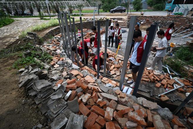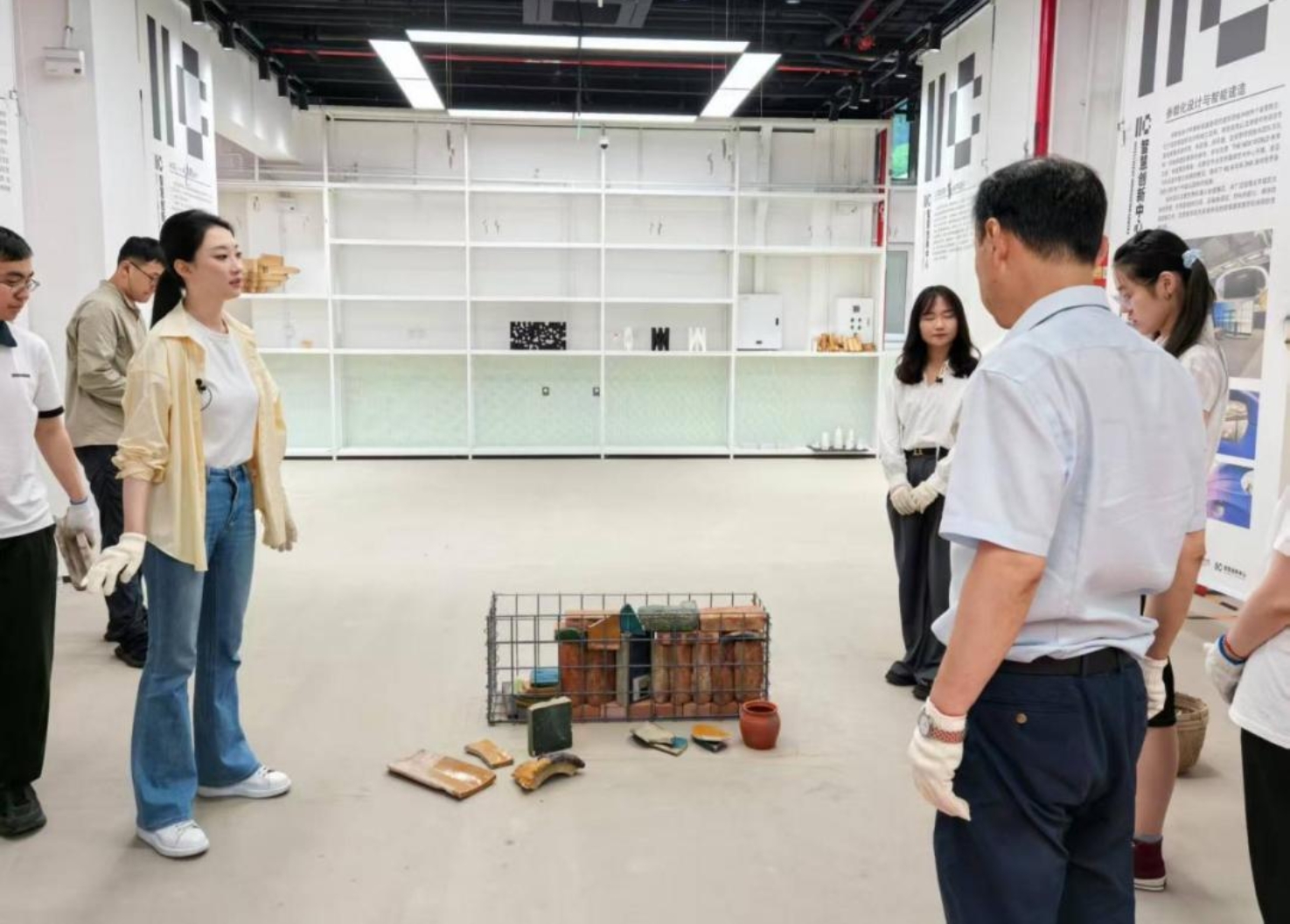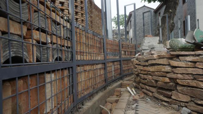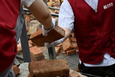 活动当天,墙体钢架结构由建筑工人搭建完成,内部填料在薛峰大师指导下由员工团队、施工单位、规自分局、镇政府和村委党员及村民共同协作完成码放与设计。设计团队根据现场收集的材料情况灵活调整构造策略,从清理场地、分拣搬运材料,到亲手把一砖一瓦填进网笼墙,把设计图纸上的想法变成了实实在在的石笼墙。员工们分拣着从灾区运来的红砖、老瓦片、带着棱角的碎琉璃,还有那些有年头的老物件,手上掂量着分量,心里琢磨着怎么搭配:这块红砖放哪儿,那片碎琉璃怎么嵌进去才好看又有味道,整个过程也成为一次集设计应变、构造尝试与团队协作于一体的教学实践。