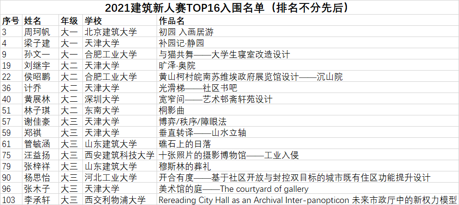 8月24日,公司建筑公司建筑学专业20级周珂帆同学的设计课作品入选2021东南·中国建筑新人赛TOP16,指导教师为刘烨、李路阳、王韬和周仪。