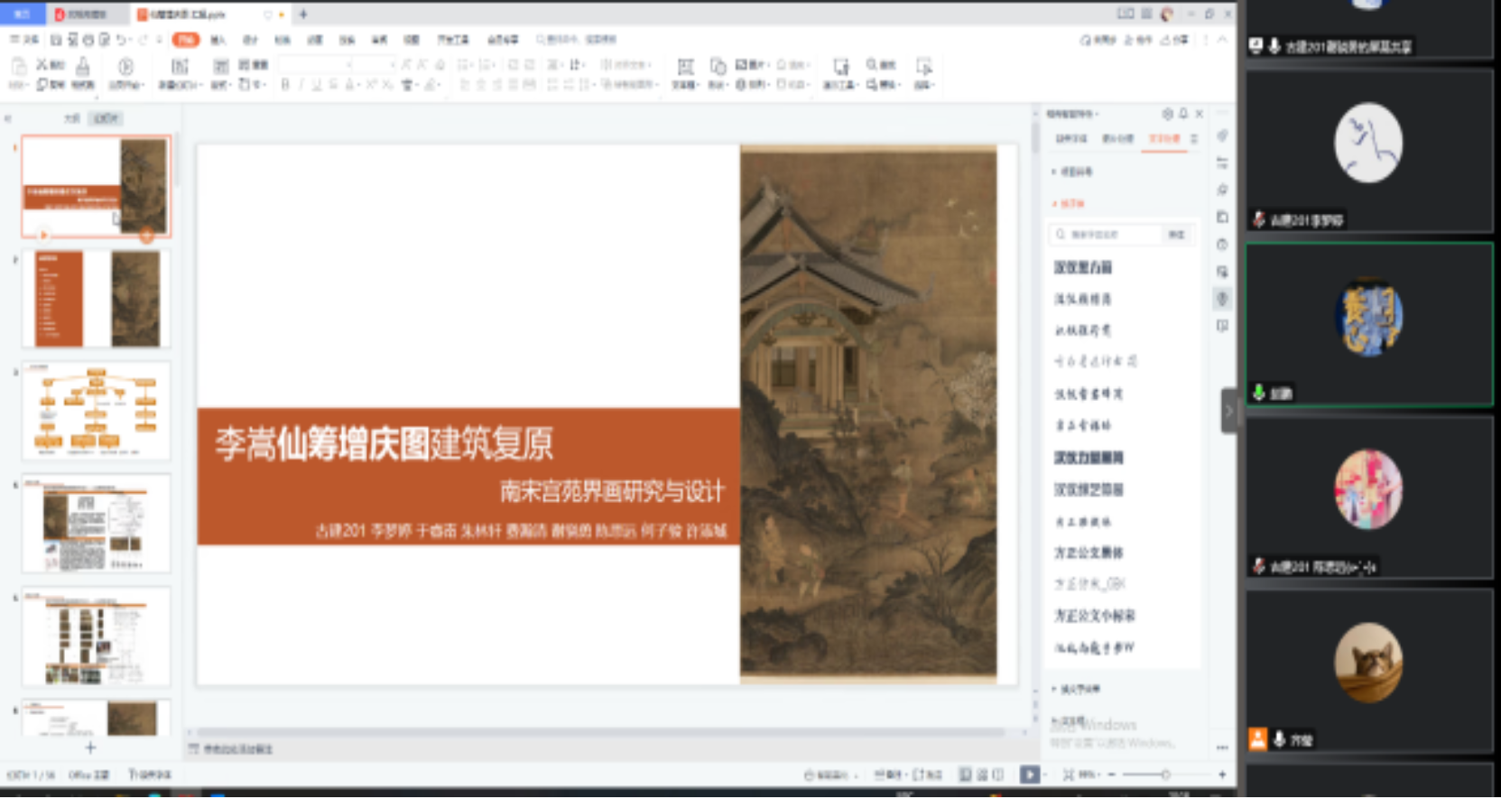 评图会首先分别由三组同学的代表逐一介绍自己研究的界画背景,分析入手的技术流线,阐述建筑研究和复原过程,讲解对南宋建筑形制、尺度等细部的推敲过程,以动画视频展示最终整体复原与设计效果。
