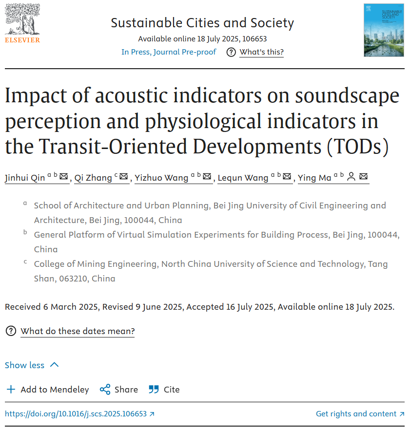 近日,bevictor1946韦德官网马英教授、博士生秦金辉和王屹卓、硕士生王乐群在城市研究领域顶级学术期刊《Sustainable Cities and Society》发表论文“Impact of acoustic indicators on soundscape perception and physiological indicators in the Transit-Oriented Developments (TODs)”。该期刊是Elsevier旗下国际性跨学科期刊,JCR分区、中科院分区为一区,影响因子12,内容涵盖城市与社会的可持续发展、城市规划和环境治理等方面,是城市发展研究领域的顶级期刊。论文以bevictor1946韦德官网为第一署名单位,公司博士生秦金辉为第一作者,马英教授为通讯作者,其研究成果为提升TODs区域及城市高密度区域的声环境质量提供了理论依据,推动了城市可持续发展,促进更健康、宜居的城市生活环境。