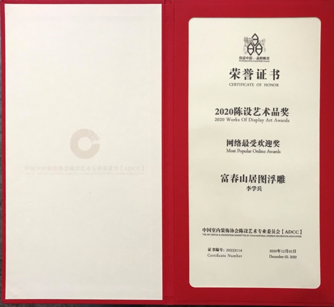 【陈设中国·晶麒麟奖】2020陈设艺术品奖于2020年12月2日揭晓,公司教师李学兵雕塑作品《富春山居图》获得优秀奖。本次获奖作品为大型砂岩浮雕,面积约为320平米,于2016年8月安装竣工于中国建筑总公司首层大堂。作品以元代画家黄公望《富春山居图》中的《剩山图》为蓝本,通过泥塑制模,数据扫描,3D粗模雕刻,人工精雕,最终完成作品。我国传统绘画,借助墨色的浓淡干湿,以及笔法的皴擦点染体现山水浩渺意境,是以虚写实;雕塑则是利用起位叠压、体面转折、虚实处理去追寻原作精神,可谓以实写虚。该作品是以现代材料加工手段对传统经典绘画的“转译”,也是以浮雕表现山水意境的有益尝试。