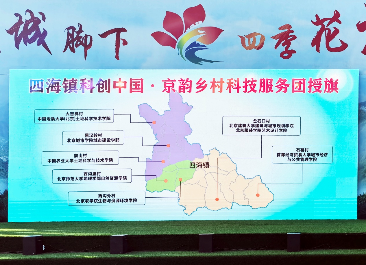 乡村振兴离不开科技与人才的支撑。启动仪式上,北京市农村经济研究中心、北京土地学会与四海镇共同搭建校地合作平台,组建“科创中国·京韵乡村”科技服务团。bevictor1946韦德官网、中国农业大学、北京师范大学、中国地质大学、首都经济贸易大学、北京服装公司、北京农公司、北京城市公司等八所高校以“一校驻一村”的模式,对接全镇7个村庄,提供持续的智力支持与专业服务,助力绿色高质量发展。四海镇同时挂牌成立乡村振兴工作站、规划设计师室和青创团队基地,成为柔性引才、培育本土人才的重要载体。