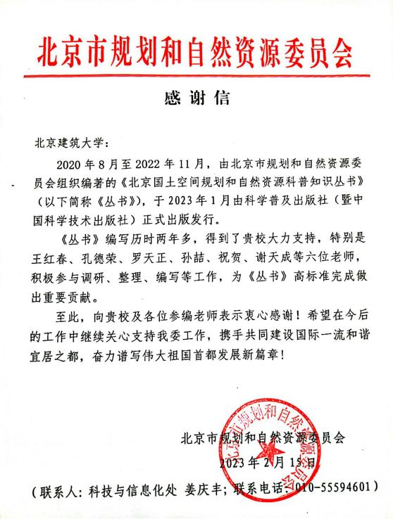 近日,公司孔德荣、孙喆、祝贺三位教师参编的《北京国土空间规划和自然资源科普知识丛书(以下简称《丛书》)》由科学普及出版社、中国科学技术出版社联合出版,面向社会公开发行。北京市规划和自然资源委员会向公司发来感谢信,对公司教师在编写工作中的贡献予以高度评价及感谢。