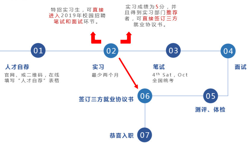 实习福利:实习享有实习津贴,表现优秀的特招实习生可直接进入2019年校园招聘笔试和面试环节。
