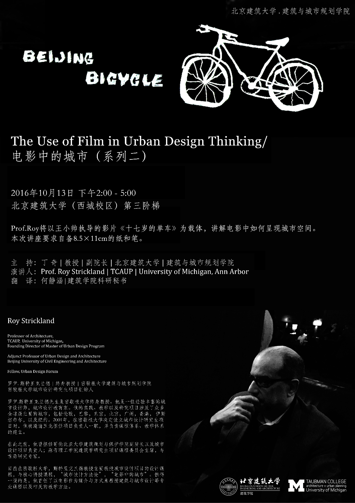 Roy讲授将以王小帅执导的影片《十七岁的单车》为媒介,与同学们共同讨论电影是如何呈现城市空间的。本次讲座需要同学们自备8.5X11的纸和笔,在讲座当中进行训练。