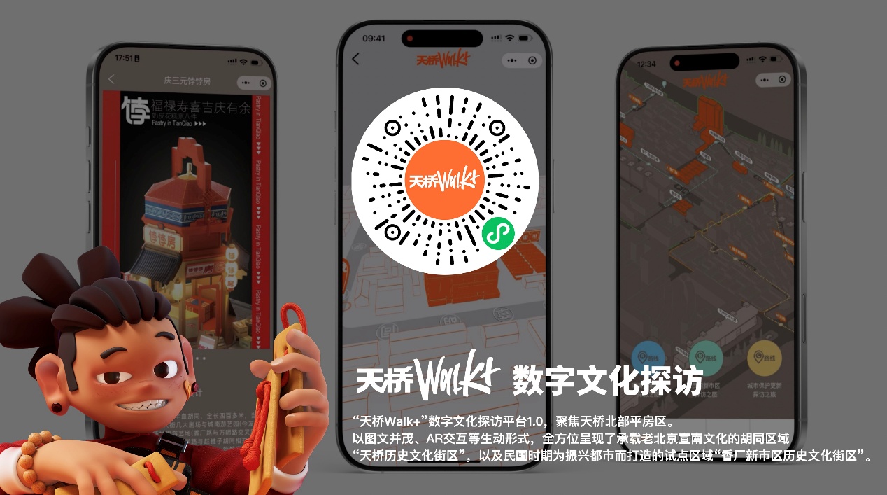 自2024年起,在公司责任规划师团队与街道办事处通力合作下,结合天桥北部平房区小微公共空间更新项目,同步布置了探访地图、方向指引、历史说明等形式多样的“京韵天桥·文化探访”导览设施100余处,市民和游客可通过扫码进入数字平台,实现“线上线下融合”的文化探访新模式。